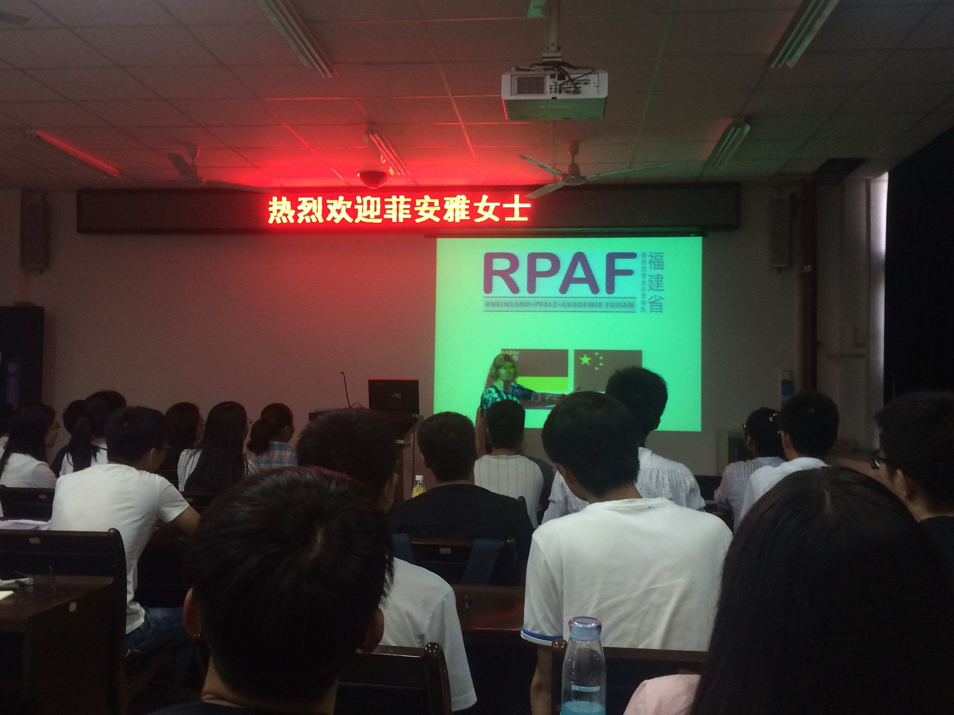 宣讲会伊始,菲安雅女士先给同学们介绍了多个与德国留学相关网站,让大家对德国留学流程有大致的了解。随后,菲安雅女士切入主题,播放了美因茨大学的招生宣传片,带领同学们去感受德国美因茨大学的美好氛围。之后,菲安雅女士从德国美因茨大学的入学要求、学费、德国的生活成本、生活品质、德国人的生活习惯等方面进行了逐一介绍,并且重点指导同学们如何申请德国的大学。优雅风趣的菲安雅女士展现了德国人细致耐心的精神,为同学们做了细致的讲解。在最后的提问环节中,许多同学积极发问,菲安雅女士就文化差异、日常生活等问题一一进行了答复。