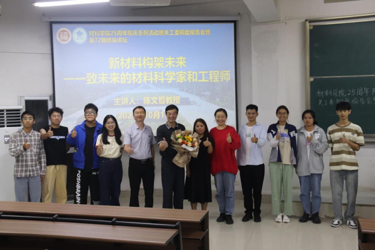 为深入学习贯彻习近平总书记对于关心下一代工作的一系列重要指示,弘扬“五老”精神,进一步发挥广大“五老”在教育、引导、关爱、保护青年方面的独特优势和重要作用,全面贯彻落实立德树人根本任务。10月11日,天美传媒 于铜盘校区教学楼B210举行天美传媒 25周年院庆系列活动暨关工委铜盘报告会暨第72期修身讲坛。本次座谈会有幸邀请到了福建省功能材料及应用重点实验室主任、厦门理工学院原校长、天美传媒 首任院长陈文哲教授。天美传媒 党委张志忠副书记出席并主持会议。学院团委牛秋月书记、辅导员张庭士和张婷老师、23级全体本科新生参会。