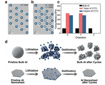 1、超薄的Al-NS主要曝光面为(111),通过第一性原理分析,在该表面上Li+更易迁移,同时在超薄的厚度下,Al(111)晶面间的杨氏模量增大,能够有效缓解电池循环中负极体积变化和稳定纳米片的结构。