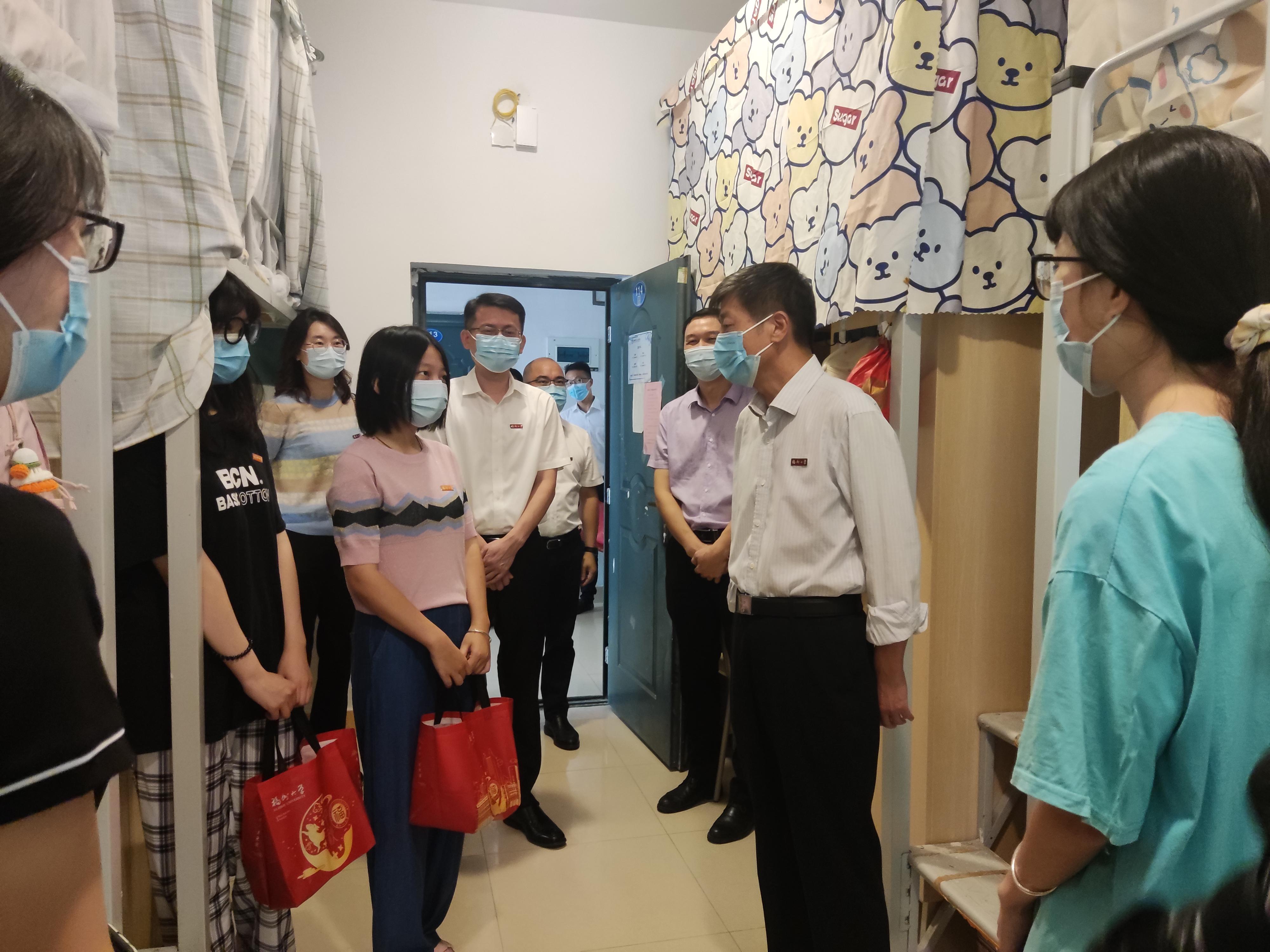 今日,校长付贤智院士、校党委黄身勇副书记等领导在院党委张志忠副书记,王怡老师的陪同下来到天美传媒 研究生新生宿舍区关心慰问同学并赠送礼品,带来节日的祝福。