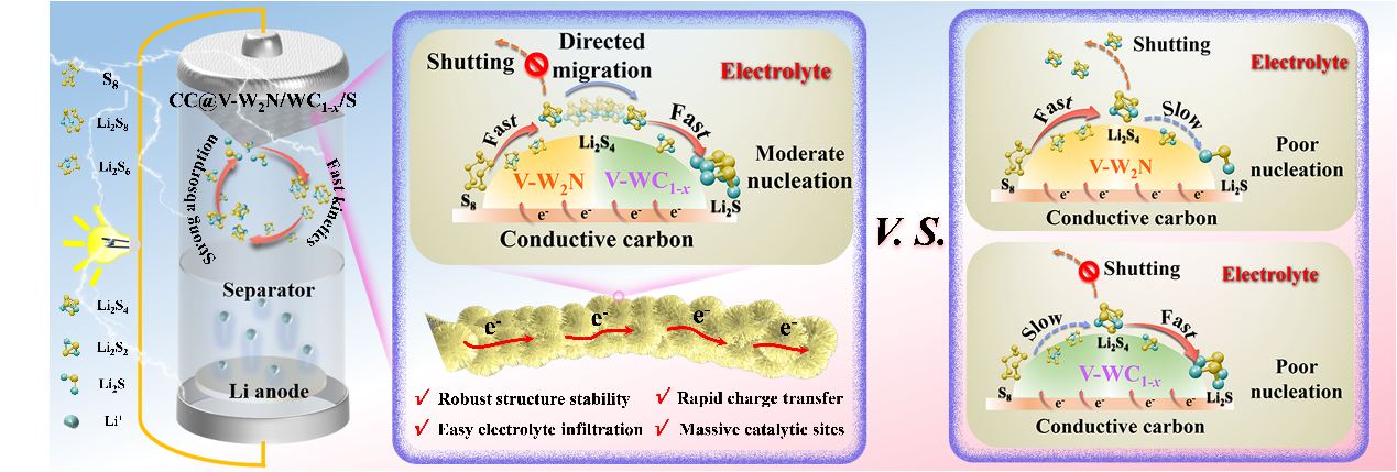 锂硫电池具有超高的理论能量密度(2600 Wh kg−1),被认为是继锂离子电池之后极具发展潜力的电化学储能体系之一,但是在充放电过程中缓慢的硫还原反应动力学和可溶性多硫化物的“穿梭效应”严重阻碍其实际应用。为此,本工作设计合成了直接生长在碳布导电基底上的自支撑钒掺杂氮化钨和碳化钨异质结构(CC@V-W2N/WC1-x)应用于锂硫电池,可以在不受粘结剂和导电添加剂干扰的情况下,串联催化多硫化物中间产物的液-液转化和液-固转化。实验和理论计算结果均证实了V-W2N对催化长链多硫化物的还原更有效,而V-WC1-x则更有利于催化短链多硫化物的转化。因此,由CC@V-W2N/WC1-x/S组装的锂硫电池表现出高的硫利用率,优异的倍率性能和良好的长期循环稳定性。该研究突出串联催化策略对多硫化物连续转化的重要意义,并为开发高性能锂硫电池电催化剂提供了一条可行途径。