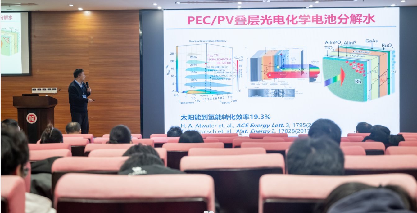最后,南京大学李朝升教授作了题为“太阳能分解水制氢”的精彩报告。报告针对半导体光电极材料展开讨论,主要内容包括三个方面:如何利用择优取向、构造近零应变图灵界面、搭建电子传输通道等手段减少光电极的内阻,提高电荷分离效率,从而提升光电催化分解水制氢的性能。讨论光电极在光催化反应过程中的表面重构现象,发现表面重构是一种质子耦合电荷转移过程。讨论如何发展高性能的电催化剂。利用静电排斥作用抑制电催化剂对氯离子的吸附,获得高效、稳定、低成本分解海水制氢的新型电催化剂。