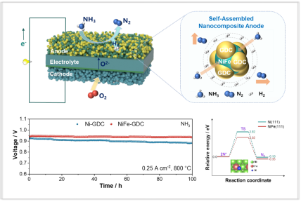 NH3作为一种前景广阔、氢含量高的低成本化学储氢介质,为氢能的储存与运输提供了高效可行的解决路径。固体氧化物燃料电池(SOFC)因其良好的燃料兼容性,可直接利用NH3作为燃料,省去了复杂的H2转化环节。然而,NH3在SOFC中的实际应用仍面临显著挑战,源于传统镍基陶瓷金属阳极在NH3环境中易发生氮化反应,导致阳极微观结构长大粗化,严重影响其长期稳定性。因此,开发一种兼具高电催化活性与优异稳定性的阳极材料,对于实现直接氨燃料电池的高效运行具有关键意义。