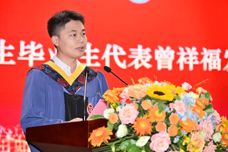 研究生毕业生代表曾祥福同学以福大三年淬炼出的“死磕”韧性和“把论文写在祖国大地上”的责任担当为底气,满怀豪情地宣告,他将以坚定的步伐继续勇毅前行,以实际行动不负这个伟大的时代,不负青春韶华。