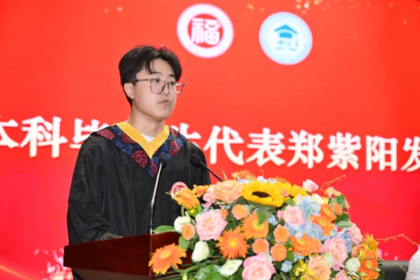 本科毕业生代表郑紫阳同学深情感谢学院的栽培,并以自身在学业科研、学科竞赛、服务担当的全面发展经历,号召同学们铭记“福大材料人”身份,将个人奋斗融入国家发展洪流,在民族复兴征程中再相逢