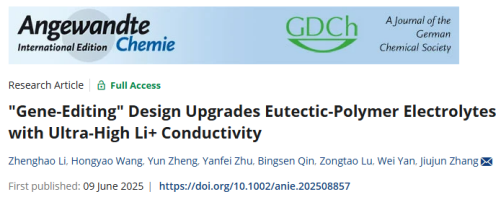 近日,天美传媒 、新能源材料与工程研究院(张久俊院士团队)在固态锂金属电池电解质领域再获重要进展。继研究成果“‘Rigid Exterior, Soft Interior’Design Enables High-Voltage Polyether Electrolytes for Quasi-Solid-State Batteries”(Angew. Chem. Int. Ed., 2025, e202502728,天美传媒 新闻://timicm.org/info/1071/18757.htm)近期发表后,固态电解质系列研究成果以“Gene-Editing Design Upgrades Eutectic-Polymer Electrolytes with Ultra-High Li+ Conductivity”为题,再次发表于化学类国际顶级期刊《Angewandte Chemie International Edition》(影响因子16.1,中科院一区)。