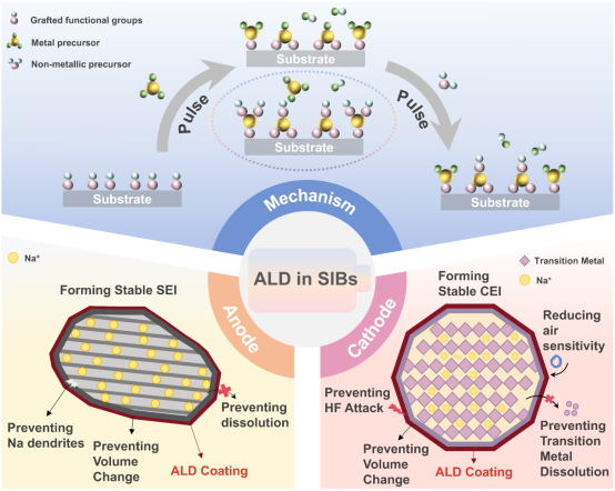 原子层沉积(ALD)技术以其独特的纳米级精度调控能力,为突破SIBs性能瓶颈开辟了创新路径。其核心自限制反应特性,能够在电极表面构筑高度均一、超薄的功能性涂层。这一设计巧妙兼顾多重效益:在显著降低无效质量、提升能量密度的同时,更能通过精准的纳米结构有效加速离子传输、强力抑制电极体积膨胀及副反应,从而大幅提升电极的结构与界面稳定性。近年来,ALD在SIBs领域的应用呈现迅猛发展态势,尤其在正极优化方面取得显著成果,但系统性研究的深度与广度仍有待拓展。本文深度聚焦ALD涂层与电极材料间的关键作用机制,系统解析了该技术在负极、正极、电解质中的前沿创新应用,并前瞻性探讨其面临的核心技术挑战与商业化前景,旨在为钠离子电池技术的加速发展注入强劲创新动能。