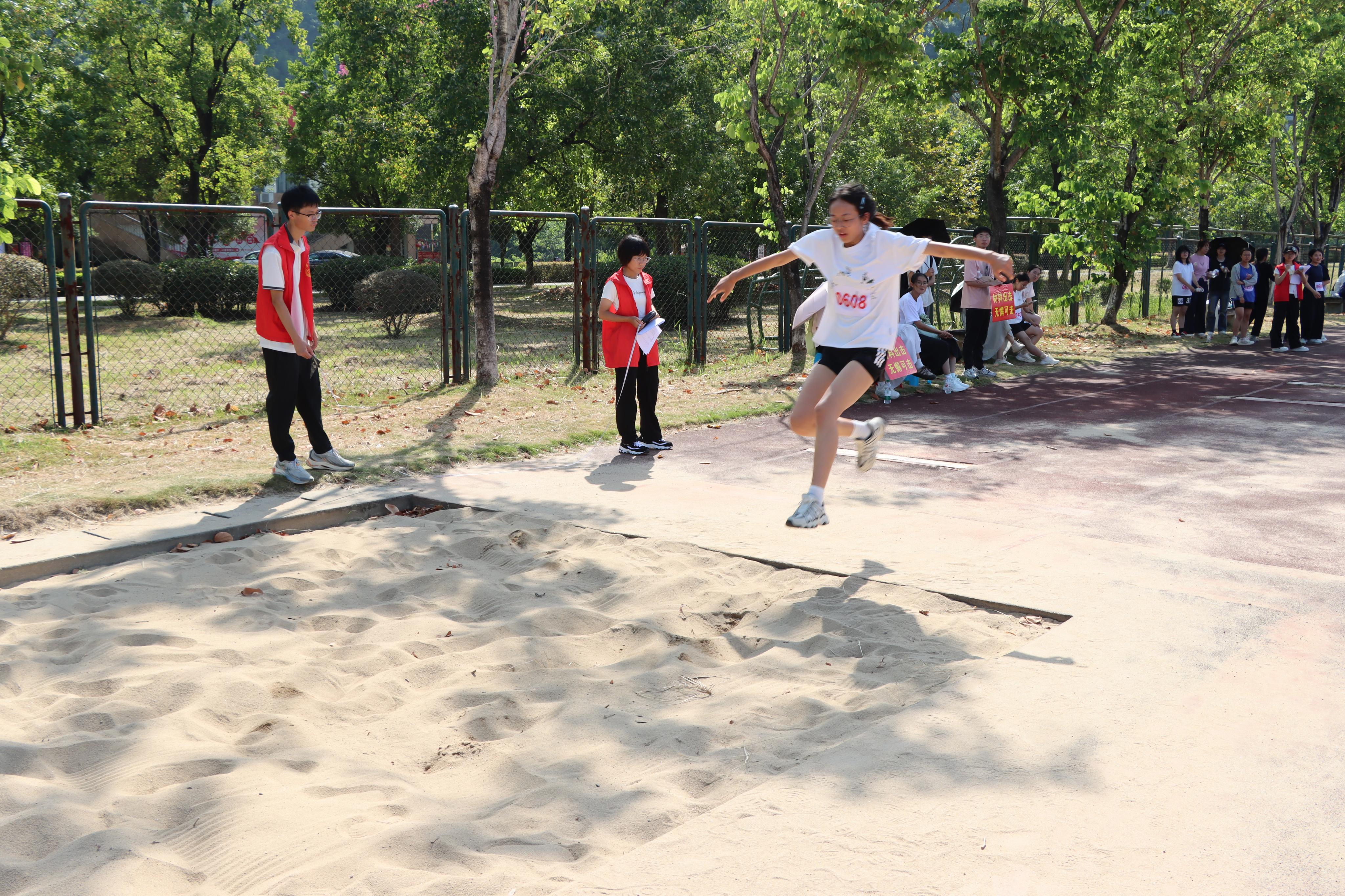 跳远赛场的精彩更上一层。依旧是林志宏,助跑时眼神坚定,起跳瞬间身体舒展,落地时溅起沙粒的瞬间,全场欢呼,他以绝对优势取得跳远第一名。女子跳远项目中,来自2025级材料3班的陈奕恬同样表现亮眼,一跃定胜负,将冠军收入囊中。