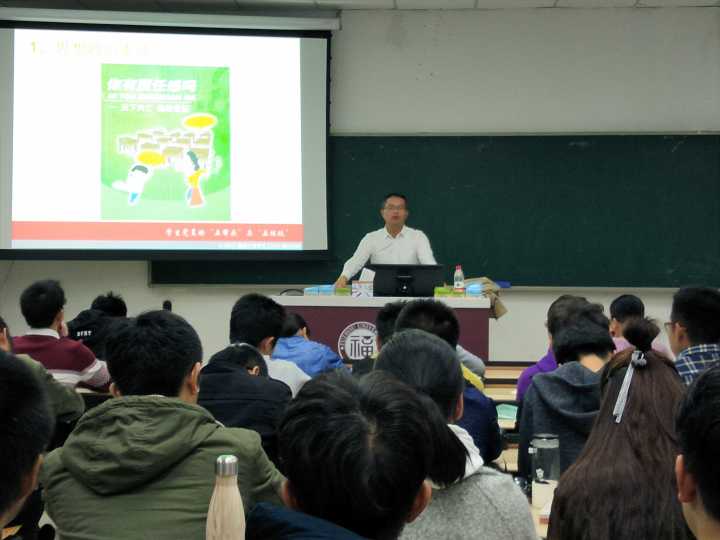 本次课程,岳老师共分为五部分讲解。首先,岳老师由土豆的故事引申至带头提升素质在政治素质中体现。提到思想政治素质,许多人不知道具体是什么,岳志强老师从宿舍情况日常小事讲起,要每个人记住“天下兴亡,我的责任!”这份责任感。随后,岳老师又提到了贵族气质与大学气质,他以小说片段向大家解释真正的贵族精神:一种以荣誉、责任、勇气、自律等一系列价值为核心的先锋精神。指出大学生应该做到自律、自强、有担当、有责任心,而党员干部更应该做好表率,应该带头创佳绩做好在学习生活中的表率。合理安排学习和工作,做到精诚敬业,创新图强。随后,岳老师也指出,学生党员应带头遵纪守法。关于这点,岳老师告诉我们要以提升理论知识为轴心,主抓学习能力,提高个人修养,落实爱岗敬业,带头遵纪守法。干部和党员,就是先锋,要做好带头作用,还要做好桥梁作用,做好带头服务群众的表率。最后,在提及带头弘扬正气在支部建设中的体现,岳老师还给大家提出了三严三实的要求:严以修身,谋事要实;严以用权,创业要实;严以律己,做人要实。鼓励大家要争做贴心人,清白人,带头人,搭桥人。