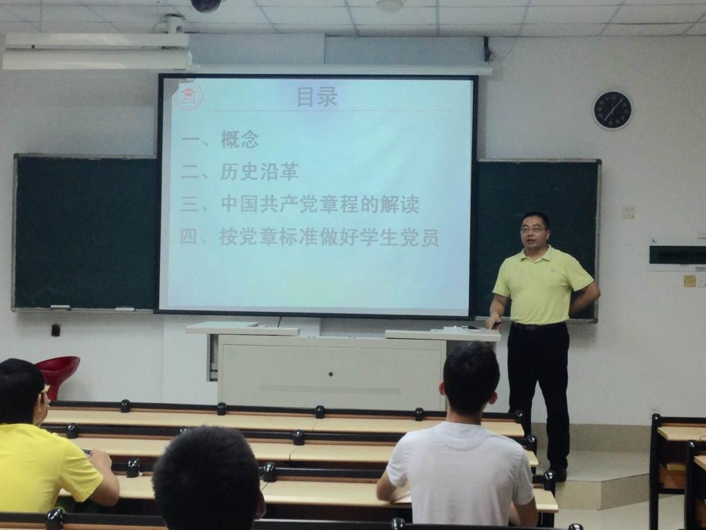 王剑龙书记先是从中共一大开始,介绍党史,简述了党的创始人的一些事迹,同学们认真听讲,时而热情澎湃,时而唉声叹气。紧接着介绍党章,中国共产党吸取经验教训,不断完善党章。“中国共产党是中国工人阶级的先锋队,同时是中国人民和中华民族的先锋队,是中国特色社会主义的领导核心。”就大学生如何做一个好党员的问题,王剑龙书记语重心长地说,大学生要认真学习马列主义等一系列理论知识,学习党的路线,方针,政策和决议;认真学习科学、文化、法律和业务知识,努力提高为人民服务水平。最后,王剑龙书记就学生党员做好带头作用提出建议:认真学习,争取得奖学金,严格遵守校纪校规,带动宿舍同学不用违规电器,不迟到早退,不晚归,不穿奇装异服,关心同学。