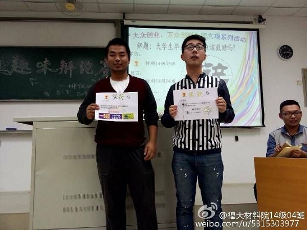 本次趣味辩论赛不仅是一场增添欢乐的活动,更是一堂关于思考人生的大课堂。或许有的同学支持大学生一毕业就去创业,亦或有人反对,但无论结果立场如何,同学们都对创业这一话题有了进一步的认识。