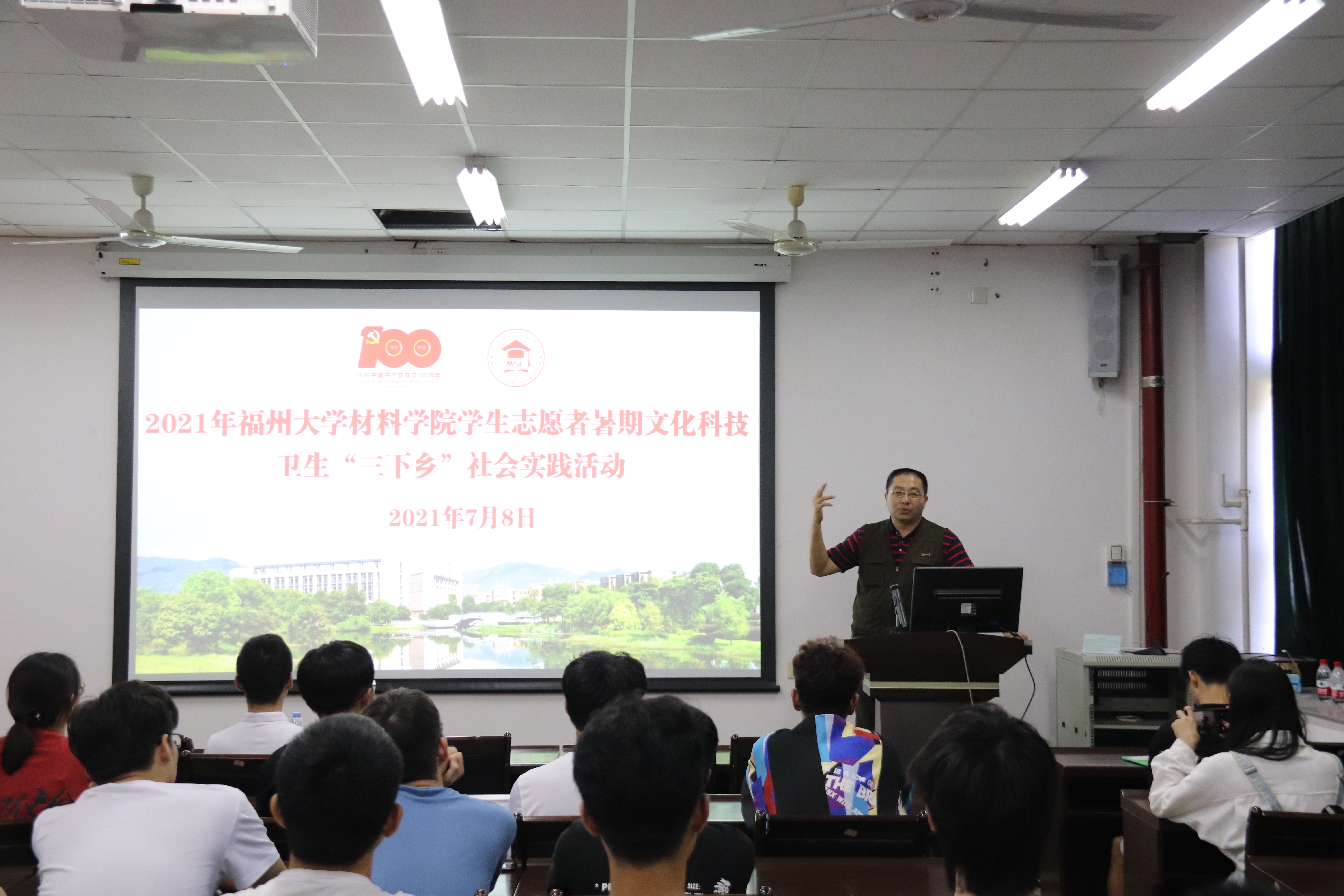 为激励天美传媒 实践队队员以饱满的精神状态奔赴各地开展社会实践活动, 7月8日上午,天美传媒 2021年学生志愿者暑期文化科技卫生“三下乡”社会实践活动出征仪式在材料楼404室顺利举行。天美传媒 党委王剑龙副书记、王文栋辅导员出席出征仪式。王文栋老师主持本次仪式,各实践队的队员悉数到场。