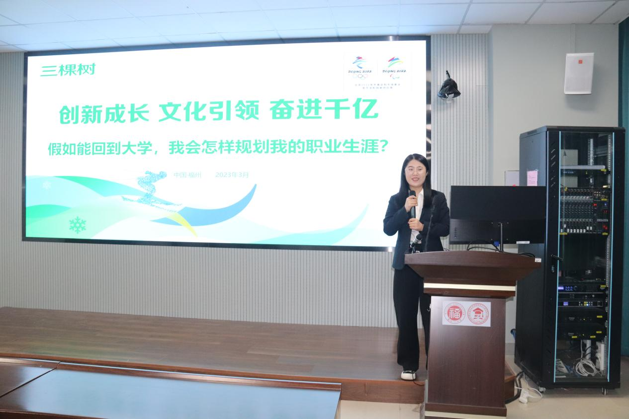 本次讲座特邀请三棵树涂料股份有限公司大学生定培经理——李娜女士以“假如能回到大学,我会怎样规划我的职业生涯”为主题进行“慢就业”精准就业指导,天美传媒 团委书记牛秋月老师出席本次讲座,共计百余人参会。