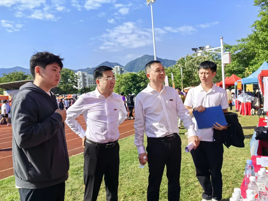 院党委罗涛书记、党委张志忠副书记、辅导员张庭士老师、张婷老师、张丽娟老师前往校运会现场观看比赛,并为运动员加油助威,同时到大本营和运动员之家慰问工作人员和后勤同学。
