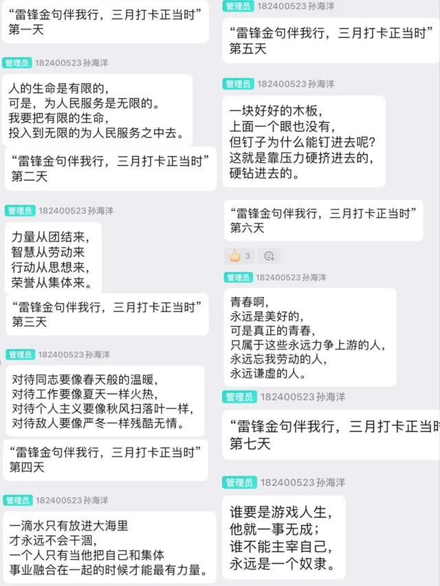 本次活动以“每日一名句抄写并发送至网络平台”为主要形式,精选雷锋经典语句,通过qq群每日推送打卡内容。