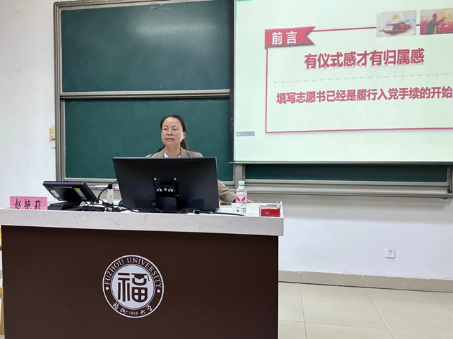组织部赵艳莉副教授给大家做《如何填好中国共产党入党志愿书》的专题讲座。赵老师给大家介绍了入党志愿书的基本内容及注意事项。尤其强调在写对党的认识时,要结合党史、新中国史、改革开放史,尤其是对近十年来亲身经历的重大历史事件来写。在课程的最后赵老师对全体学员提出要求,让每一位学员要从党员义务的八条中查找自身的不足。