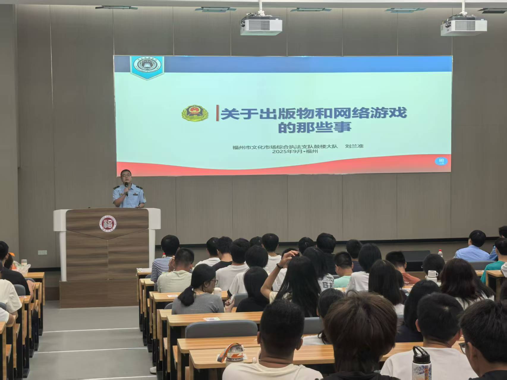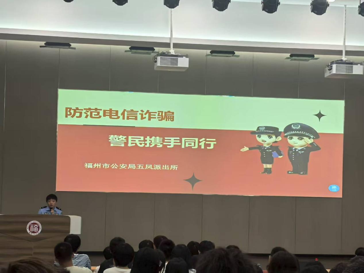 9月15日晚19点,天美传媒 联合鼓楼区委宣传部、网信办、五凤街道党工委、办事处及五凤派出所,在天美传媒 铜盘校区科报厅B举办“青春护航・安全同行”新生主题宣讲活动。活动特邀福州市文化和旅游局执法人员刘兰准老师、福州市公安局五凤派出所案审中队赵汇警官担任主讲人,辅导员张丽娟老师出席本次活动,天美传媒 2025级本科新生参与。