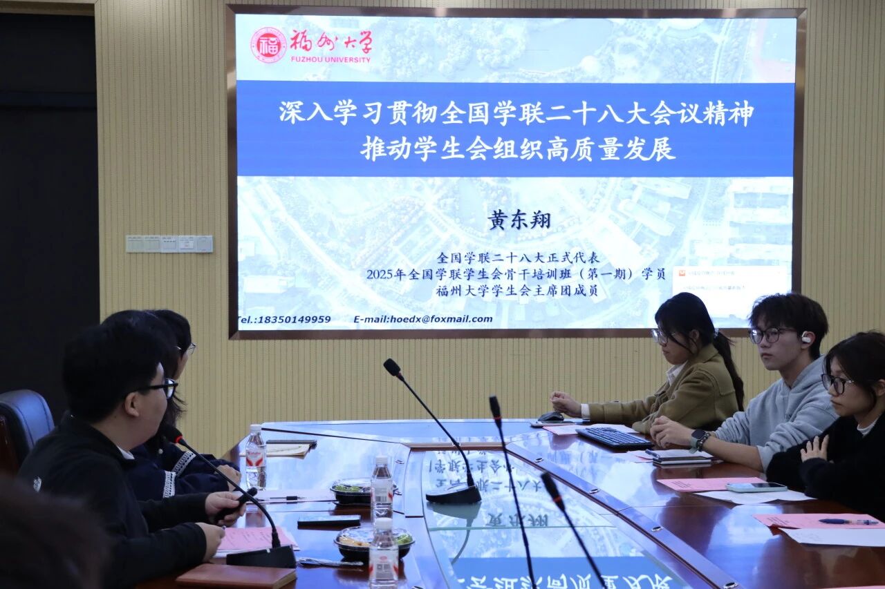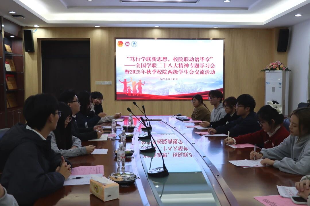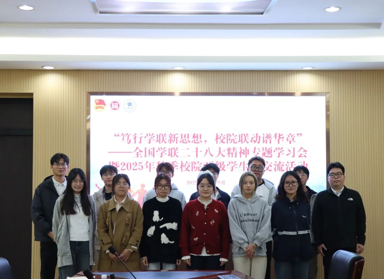 为深入学习贯彻全国学联二十八大精神,推动校院两级学生会协同高质量发展,11月19日19:00,天美传媒 于嘉锡楼313举办“笃行学联新思想,校院联动谱华章”专题学习会暨2025年秋季校院两级学生会交流活动。全国学联二十八大正式代表兼校学生会主席团成员黄东翔同学、校学生会执行主席李思嘉同学、校学生会主席团成员陈艺榭同学、邱国强同学出席本次活动,天美传媒 学生会部分成员与会。