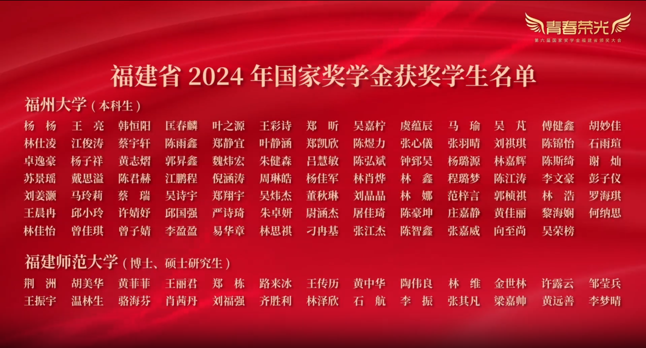 作为福大学子,看到学长学姐登台领奖、师生参演情景励志剧《世界赠予我的》,我倍感自豪。获奖学子中,有深耕科研的探索者,有坚守热爱的追光者,他们的故事诠释了奋斗的意义。张彦部长“胸怀国之大者”的勉励,更让我明确了青年担当。我将以榜样为镜,在专业学习中深耕不辍,让青春在强国建设新征程中绽放绚丽光彩。