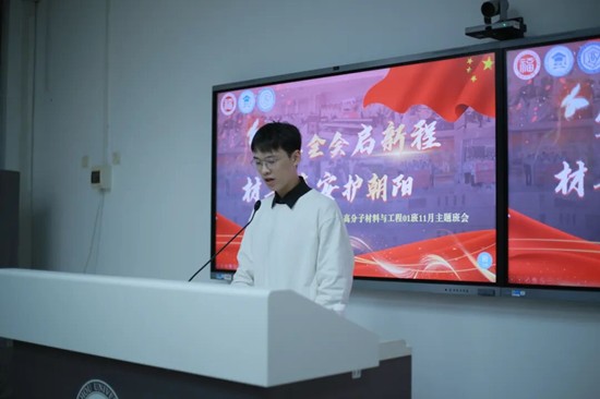 随后,团支书黄思雨展开深入研学。她聚焦“高水平科技自立自强”、“经济社会发展绿色转型”两大核心,紧扣高分子专业特色,以光刻胶树脂攻关、可降解包装材料研发等实例为引,阐释了材料专业赋能国家战略的实践路径,让同学们明晰专业价值与时代需求的同频共振,也更坚定了以专业所长服务国家发展大局的信念。