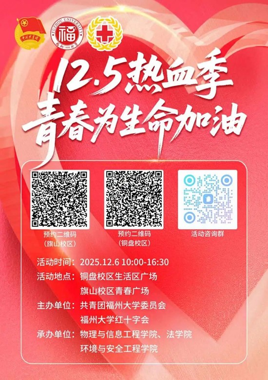 如果你也愿意投身无偿献血的行列,为生命续航、为公益添彩,可加入献血咨询QQ群:138116019 获取最新安排;或于12月6日10:00—16:30前往铜盘校区生活区广场、旗山校区青春广场现场报名,让爱与热血持续传递。