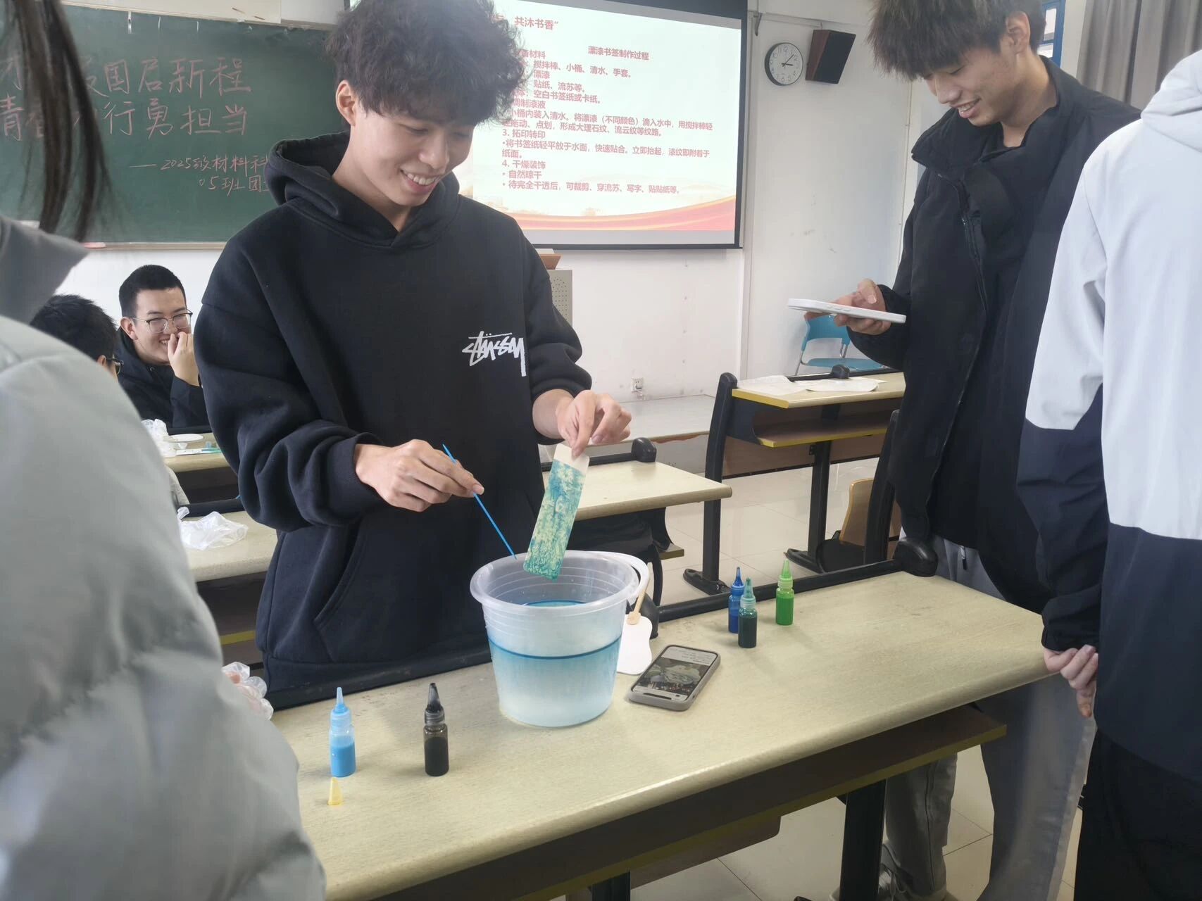 为丰富实践活动形式,推动专业知识与传统文化深度融合,团支部开展“漂漆制签、悟材科之妙”文创实践活动,并邀请蔡道平老师为同学们讲解漂漆工艺的原理与操作步骤。同学们在老师的指导下,调漆、泼洒、覆纸、揭签,一步步完成专属的漂漆书签制作,指尖翻飞间感受着漆液在纸面晕染出的独特纹理。此次文创实践活动,既让同学们体验了传统工艺的魅力,又实现了专业知识的生活化应用,有效激发同学们对专业学习的兴趣。
