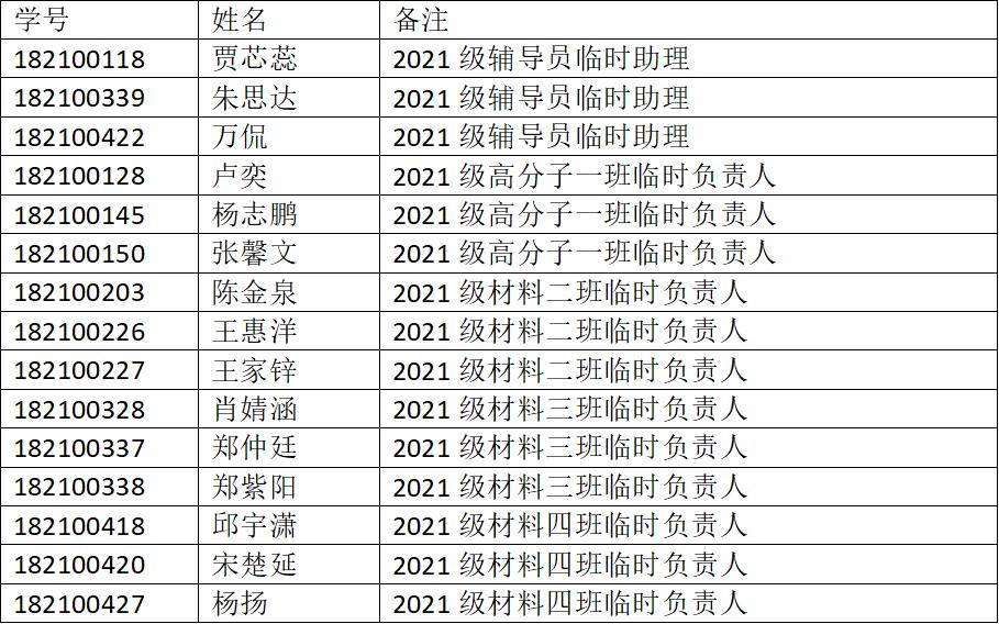 经学生本人申请、班导考核及辅导员面试审核,同意推选贾芯蕊等3名同学为天美传媒 2021级新生辅导员临时助理,推选卢奕等12名同学为2021级新生班级临时负责人。现将具体名单公示如下: