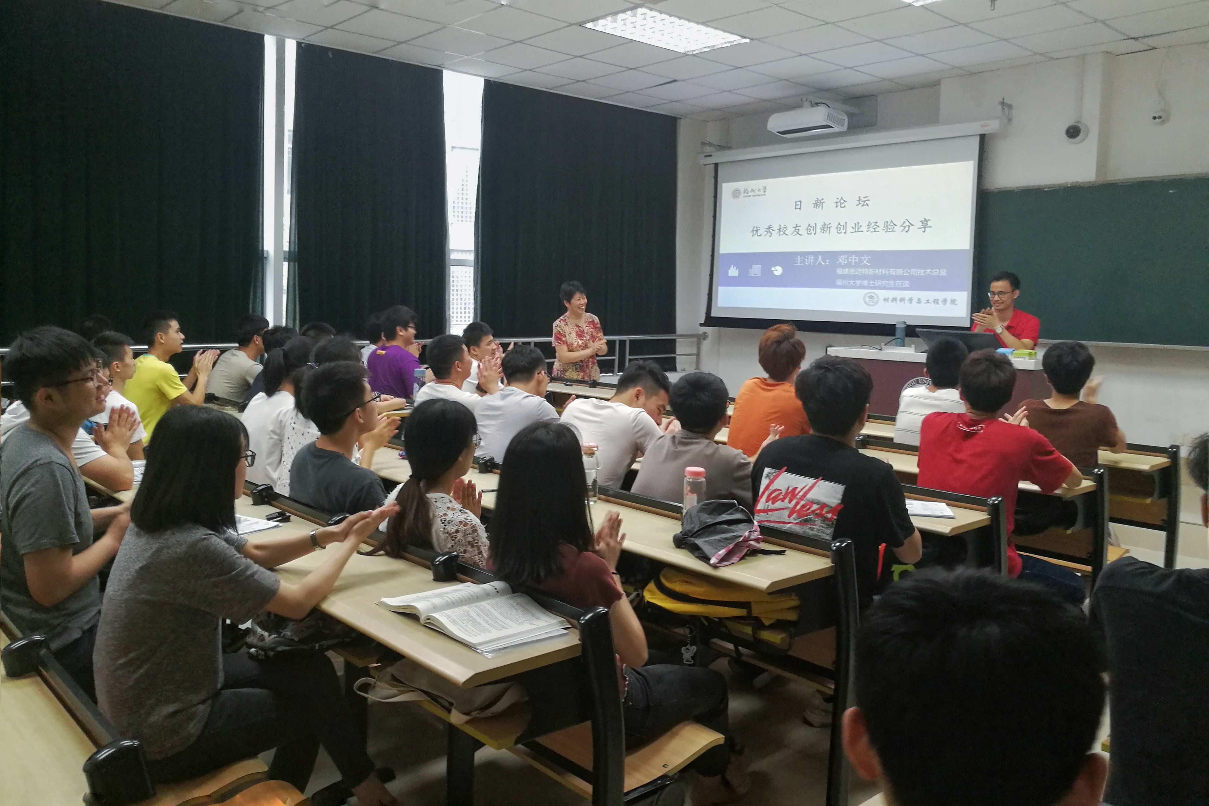 日新论坛第50讲——优秀校友创新创业经验分享会于西二-207顺利举行。讲座邀请到福建恩迈特新材料有限公司技术总监邓中文校友为同学们做出分享。分享会由高分子材料专业系主任吕秋丰老师主持。