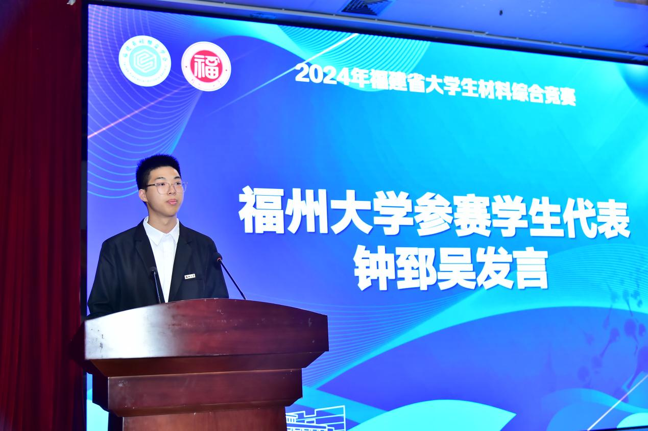 参赛学生代表钟郅吴同学发言,作为一名材料学子,要敢担当,保持初生牛犊不怕虎、越是艰险越向前的刚健勇毅,保持对理论学习的热爱,怀揣对实践探索的热忱,在新时代的广阔舞台上施展才干,再谱华章。