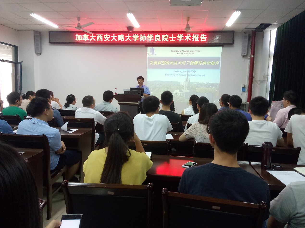 2017年6月23日上午,加拿大西安大略大学、加拿大纳米能源材料领域首席科学家、加拿大皇家科学院院士和加拿大工程院院士孙学良教授在材料楼404为我校师生作题为“发展新型纳米材料用于能源转换和储存”的学术报告。报告会由詹红兵院长主持,学院教师和研究生积极参加了报告会。