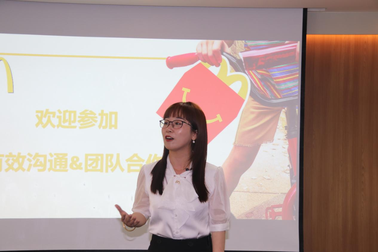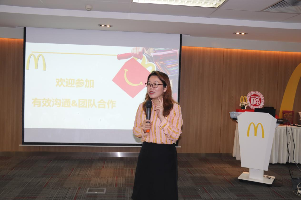 活动主题为麦当劳团体辅导《有效沟通与团队合作》,活动由麦当劳人力资源部高级招募顾问吴海霞女士主持,麦当劳训练与发展部 高级训练顾问曹莹女士主讲,麦当劳人力资源部招募主任林孔焰先生协助,学院团委牛秋月书记、兼职辅导员郑晨宇老师、团委、学生会及研究生会主席团成员、各部门负责人等青马班成员参与。